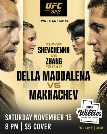 Whether you're a hardcore MMA fan or just looking for a great place to watch with friends, Big Willies has you covered. Get here early, grab a seat, and let’s watch some fights!
